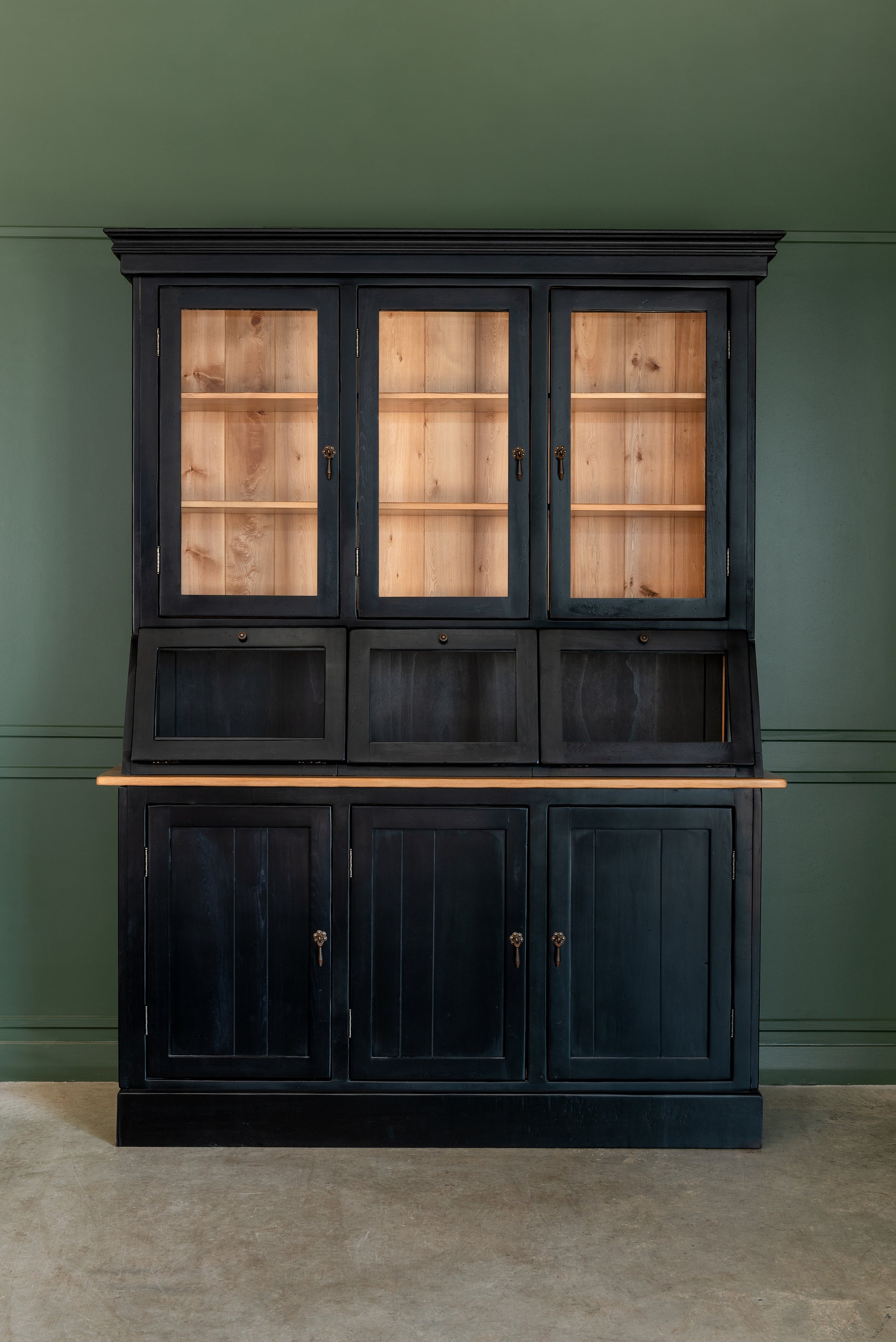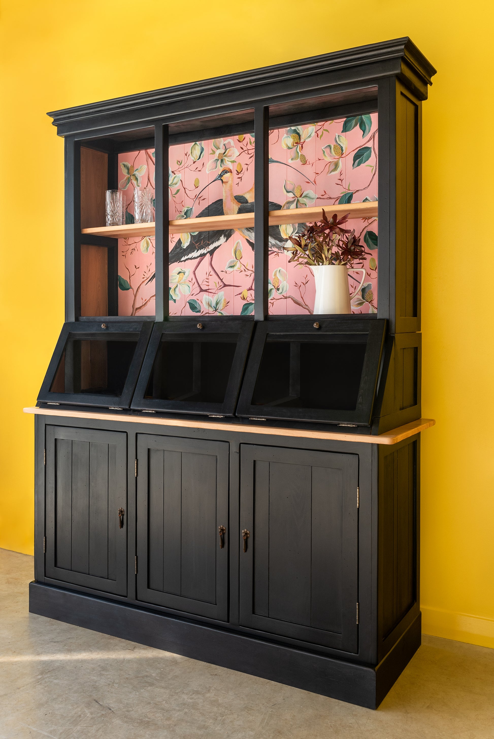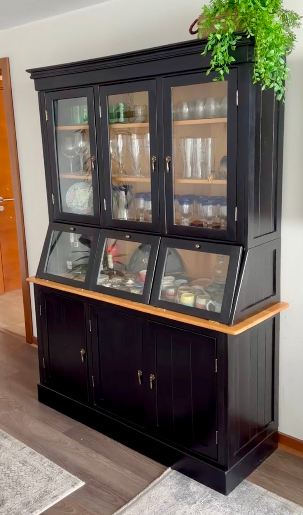 Una maravilla de mueble, diseñado a partir de los antiguos despenseros de Almacenes, cuenta con una vitrina inclinada, vitrina superior y una cómoda Buffet en su inferior. Ideal para guardar lozas, exponer tus objetos más preciados y ponerlo en tu cocina o living comedor.