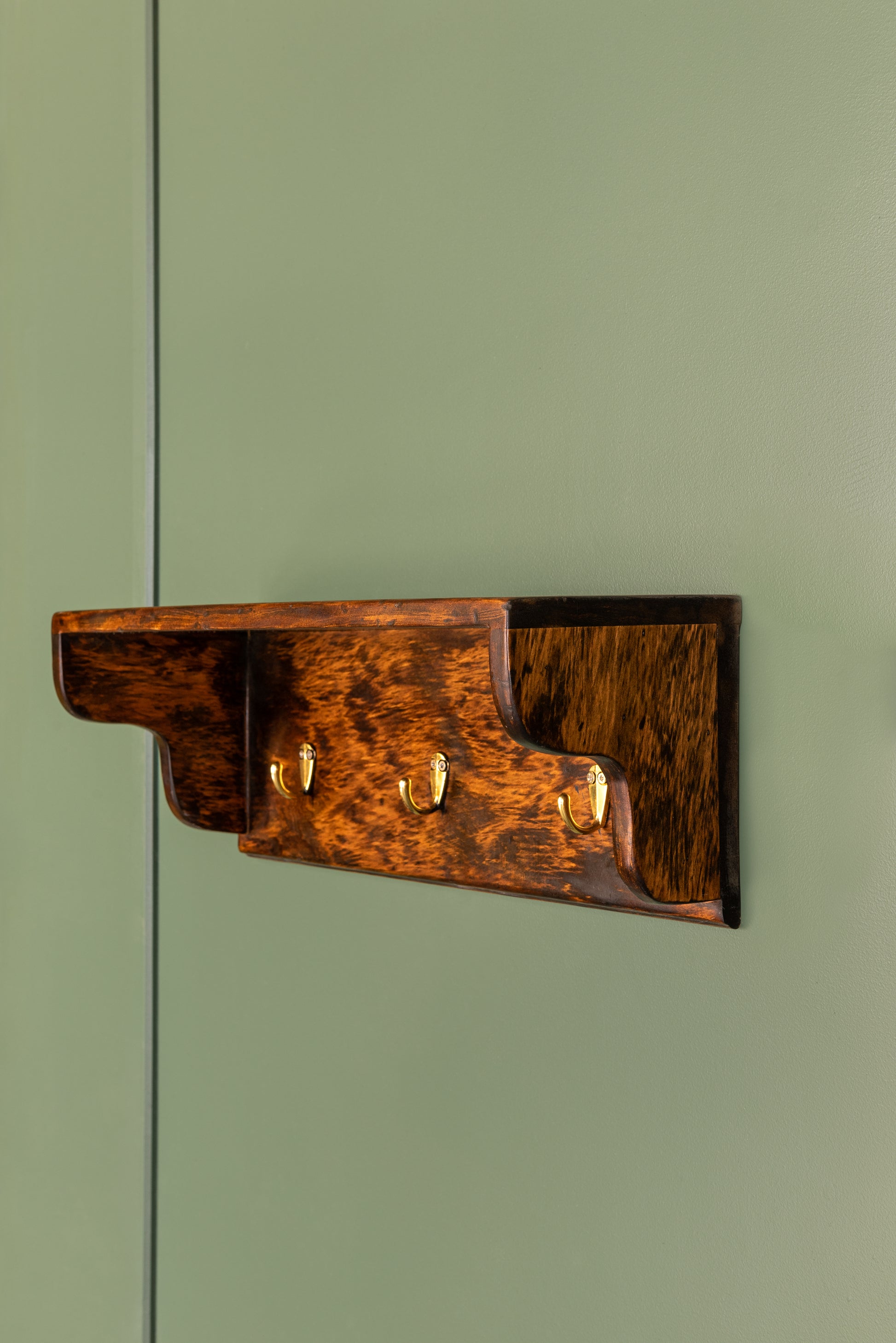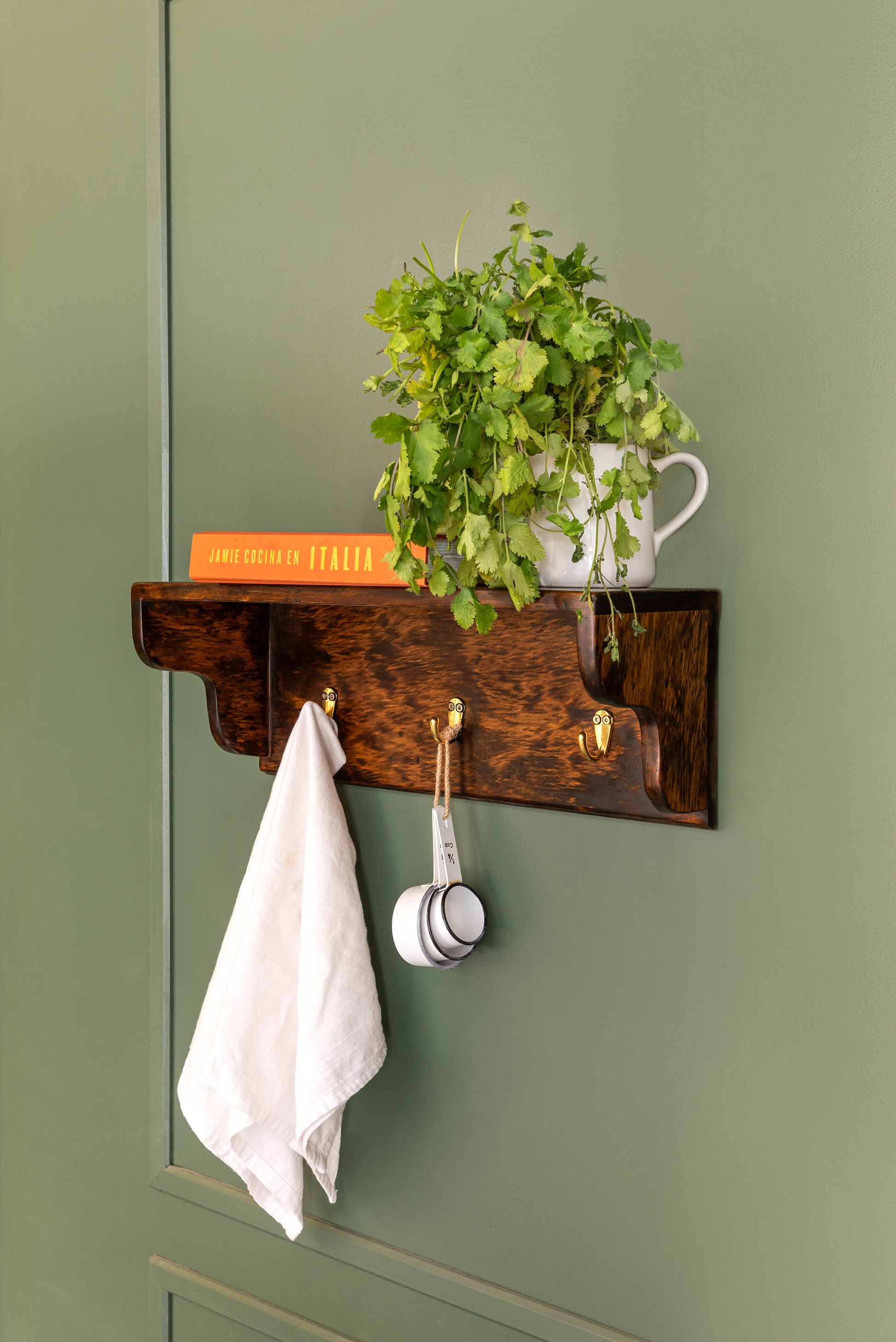 Esta repisa fabricada en mañío lleva tres ganchos de fierro ideal para usar de perchero en un dormitorio o en la cocina para colgar paños y utensilios.